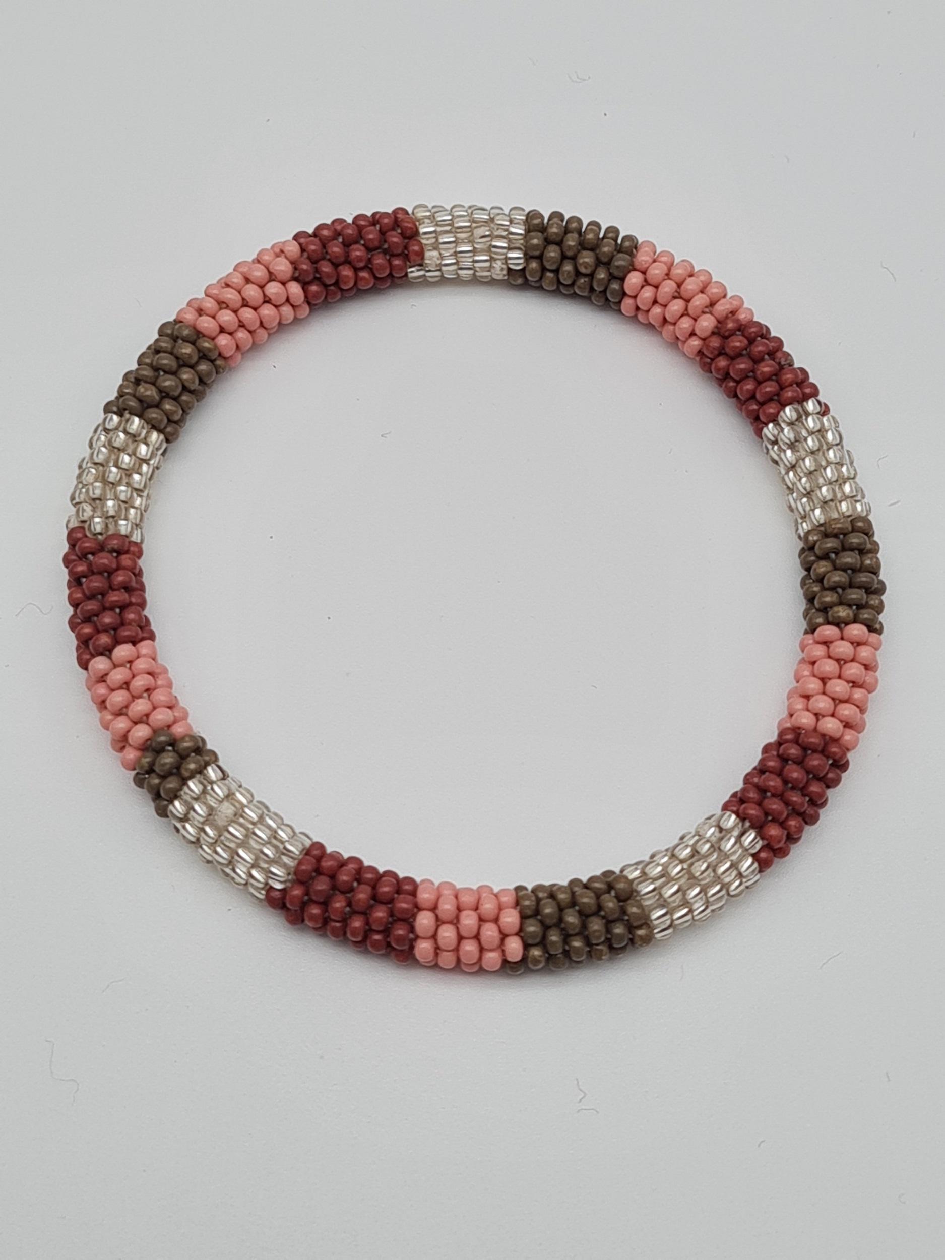 Elastische Roll-Armbänder in zarten Altrosa- und Taupe-Tönen, verziert mit verschiedenen Mustern.
