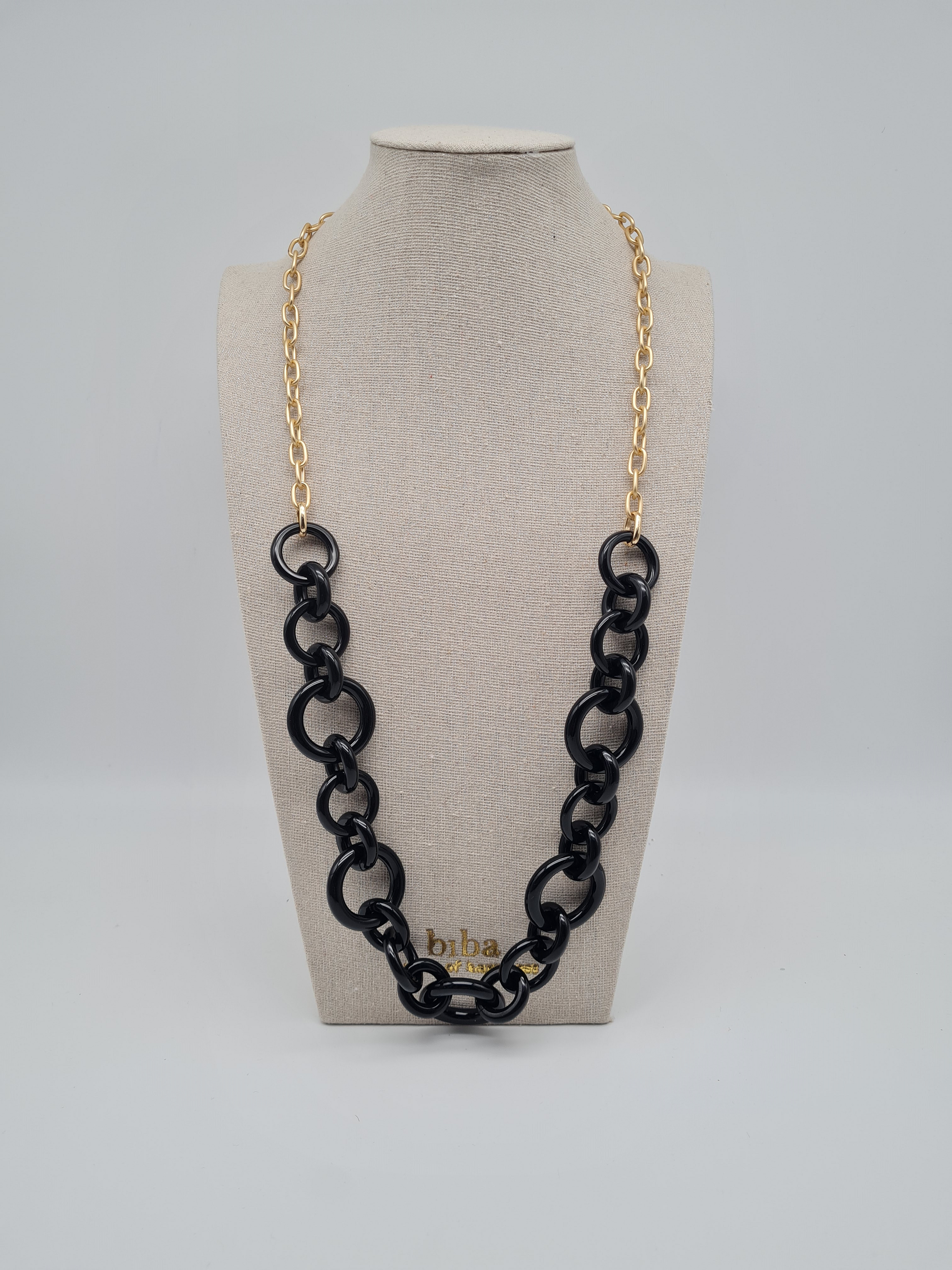 Diese edle Biba Halskette kombiniert eine goldfarbene Gliederkette mit stilvollen schwarzen Acryl-Elementen und schafft damit einen modernen, festlichen Look. Die nickelfreie Verarbeitung sorgt für angenehmen Tragekomfort – ideal auch für empfindliche Haut.