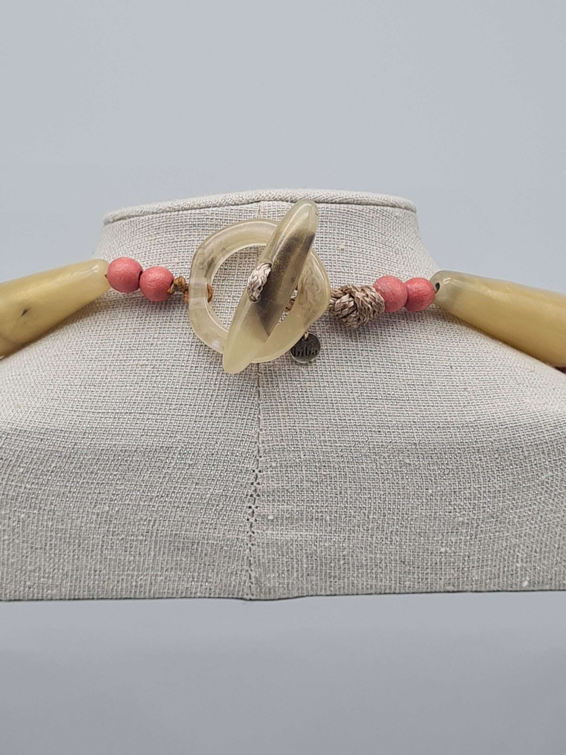 Diese auffällige Biba Halskette kombiniert warme Holz- und Harzelemente in intensiven Rot-, Orange- und Korallentönen zu einem echten Statement-Piece. Die mehrreihige Gestaltung verleiht der 60 cm langen Kette Volumen, Struktur und einen modernen, künstlerischen Look.
