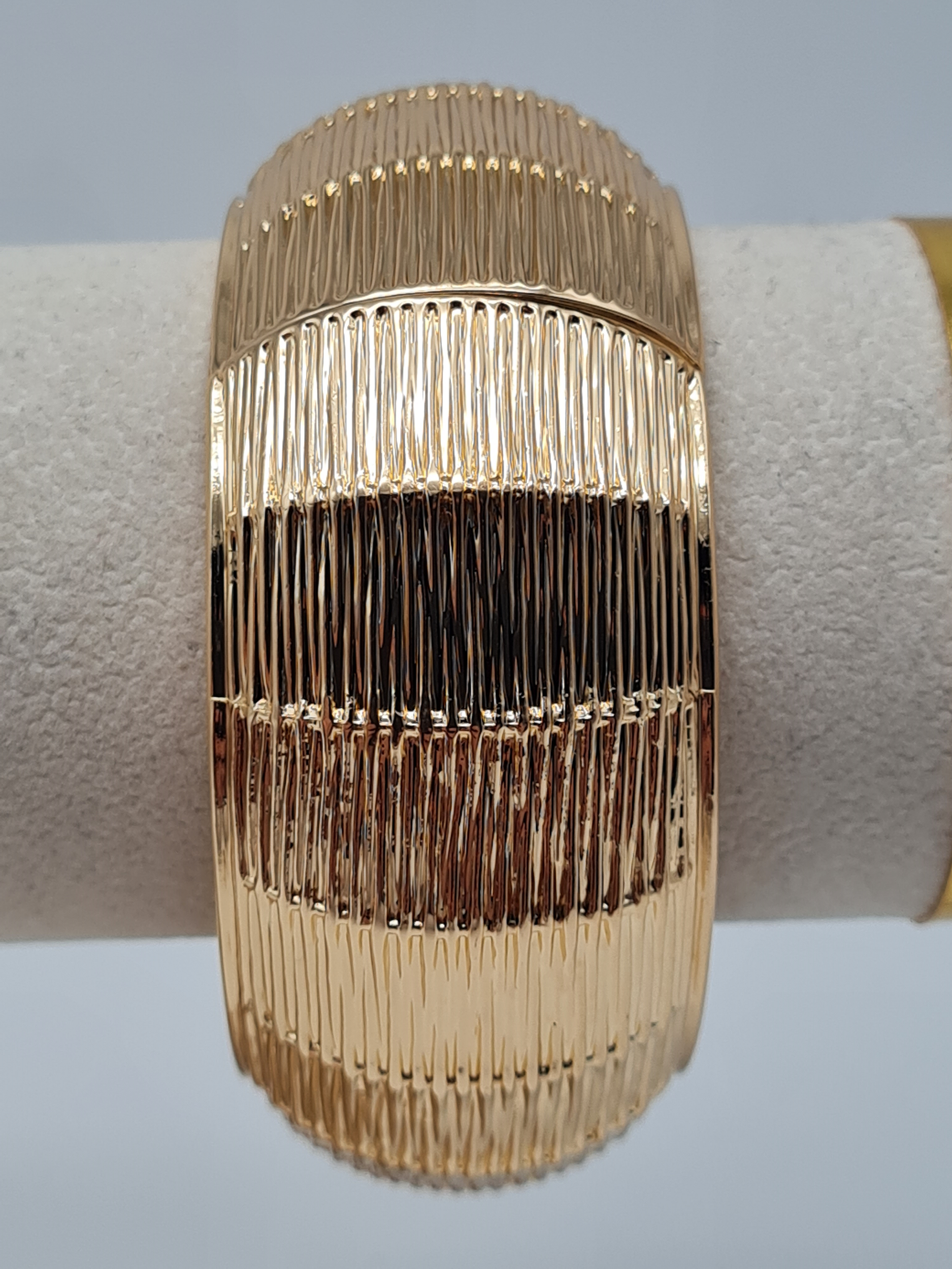 Stilvoll und modern: Das Biba Klapparmband überzeugt mit einem edlen geflochtenen Reliefmuster, das dem Schmuckstück Tiefe und Ausdruck verleiht. In glänzendem Goldton gestaltet, ist es ein zeitloses Accessoire, das Eleganz und Trendbewusstsein perfekt verbindet.