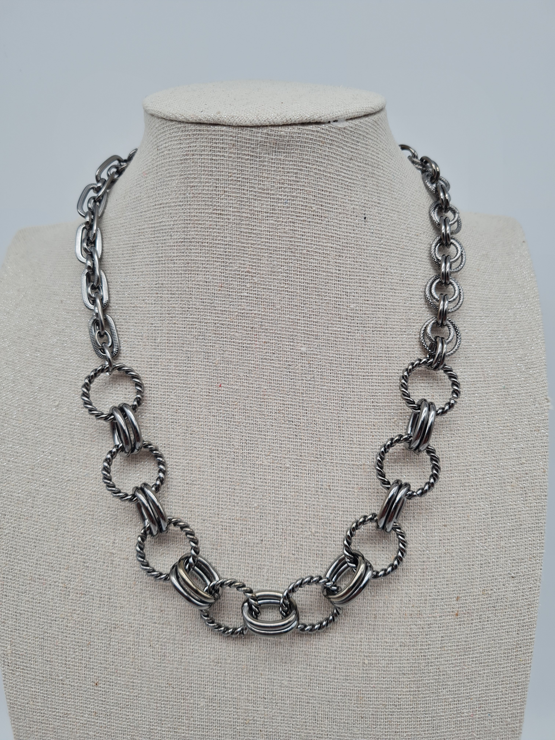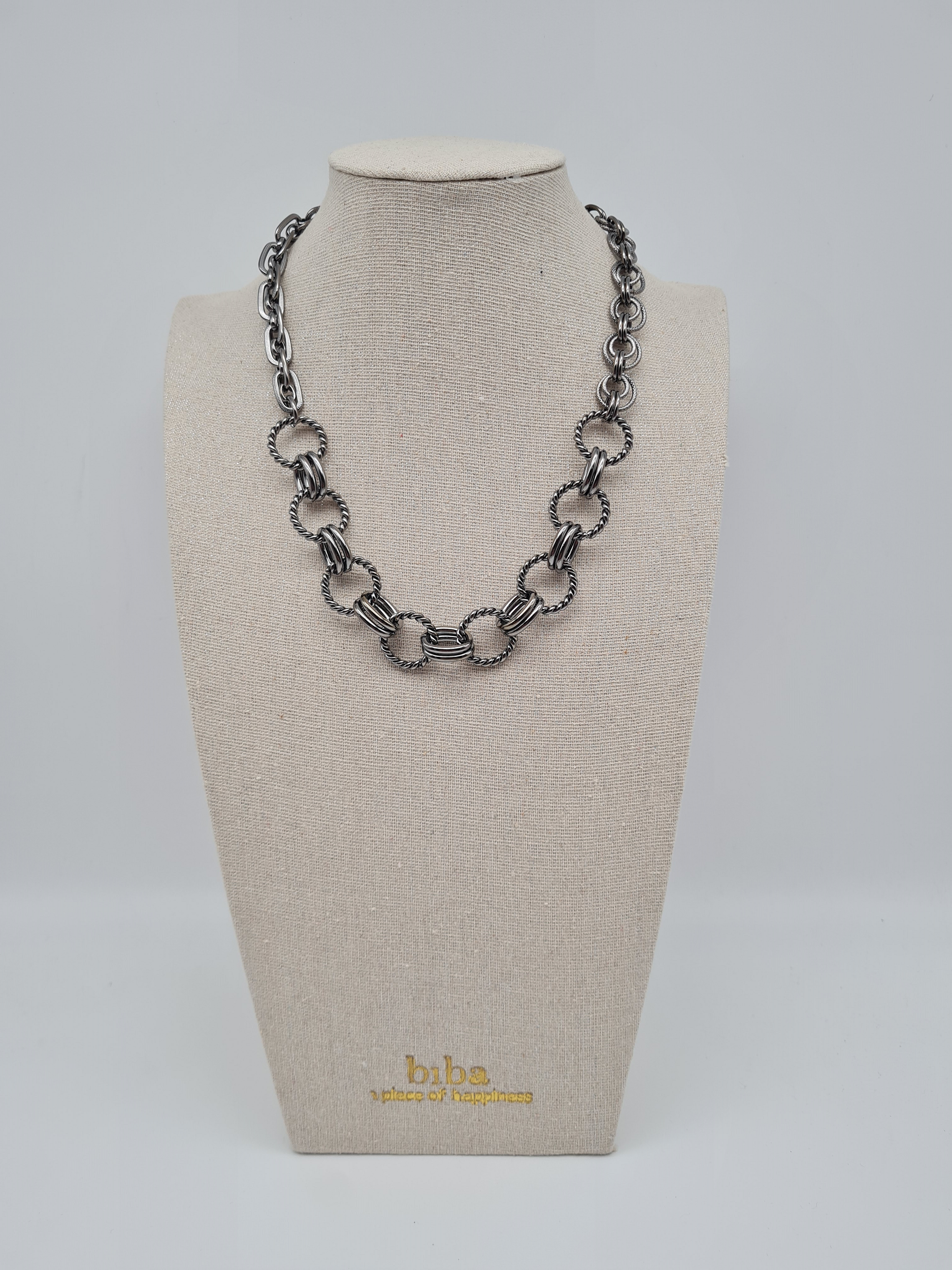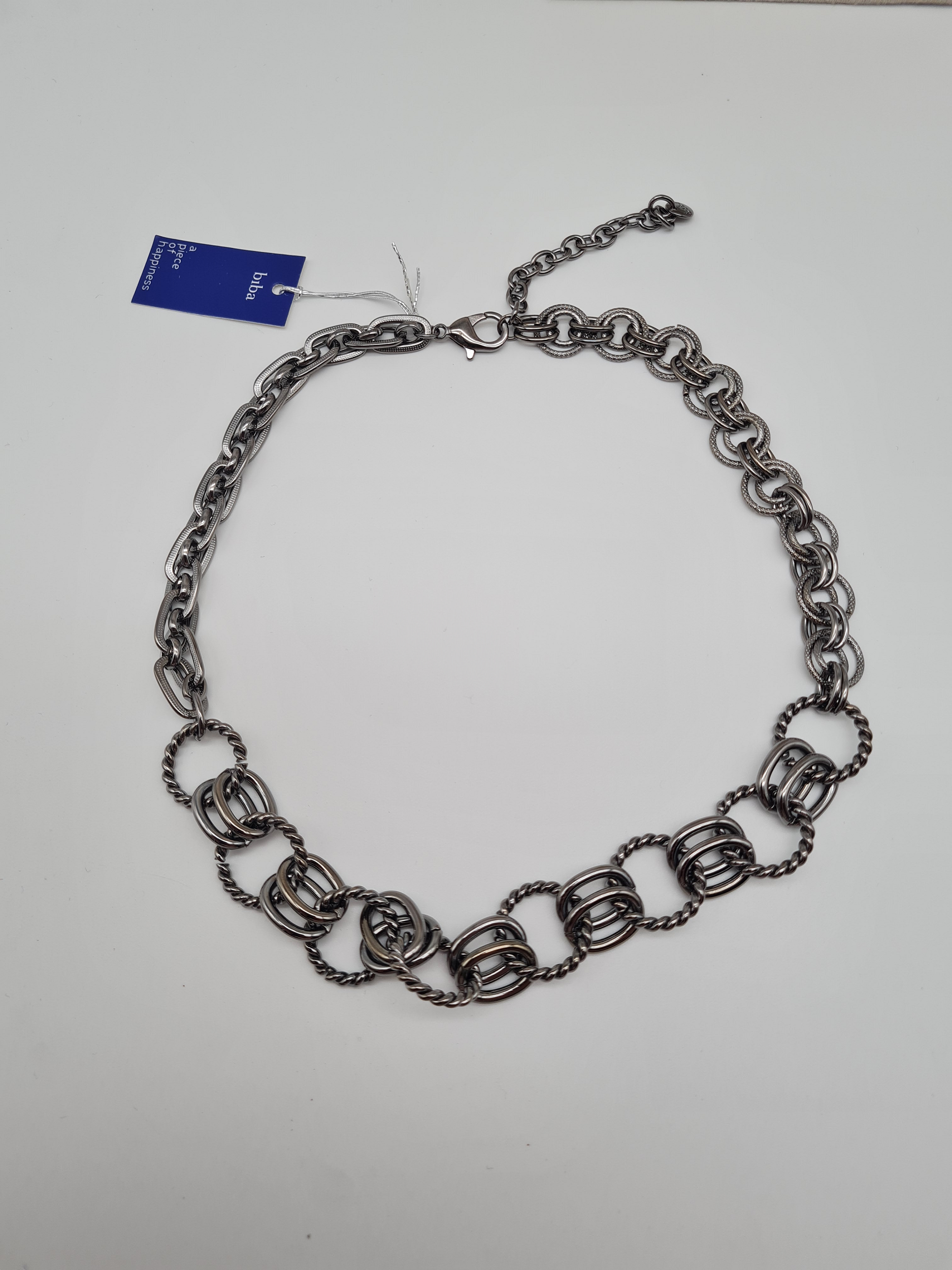 Die kurze Metallhalskette im edlen Gun-Metal-Look setzt ein starkes Statement. Kühl, urban und doch zeitlos – sie verleiht jedem Outfit eine markante Note und unterstreicht deinen individuellen Stil. Ob als trendiger Akzent zum Streetstyle oder als eleganter Kontrast zu schlichten Basics: diese Kette überzeugt durch ihre moderne Ausstrahlung und unverwechselbare Präsenz.