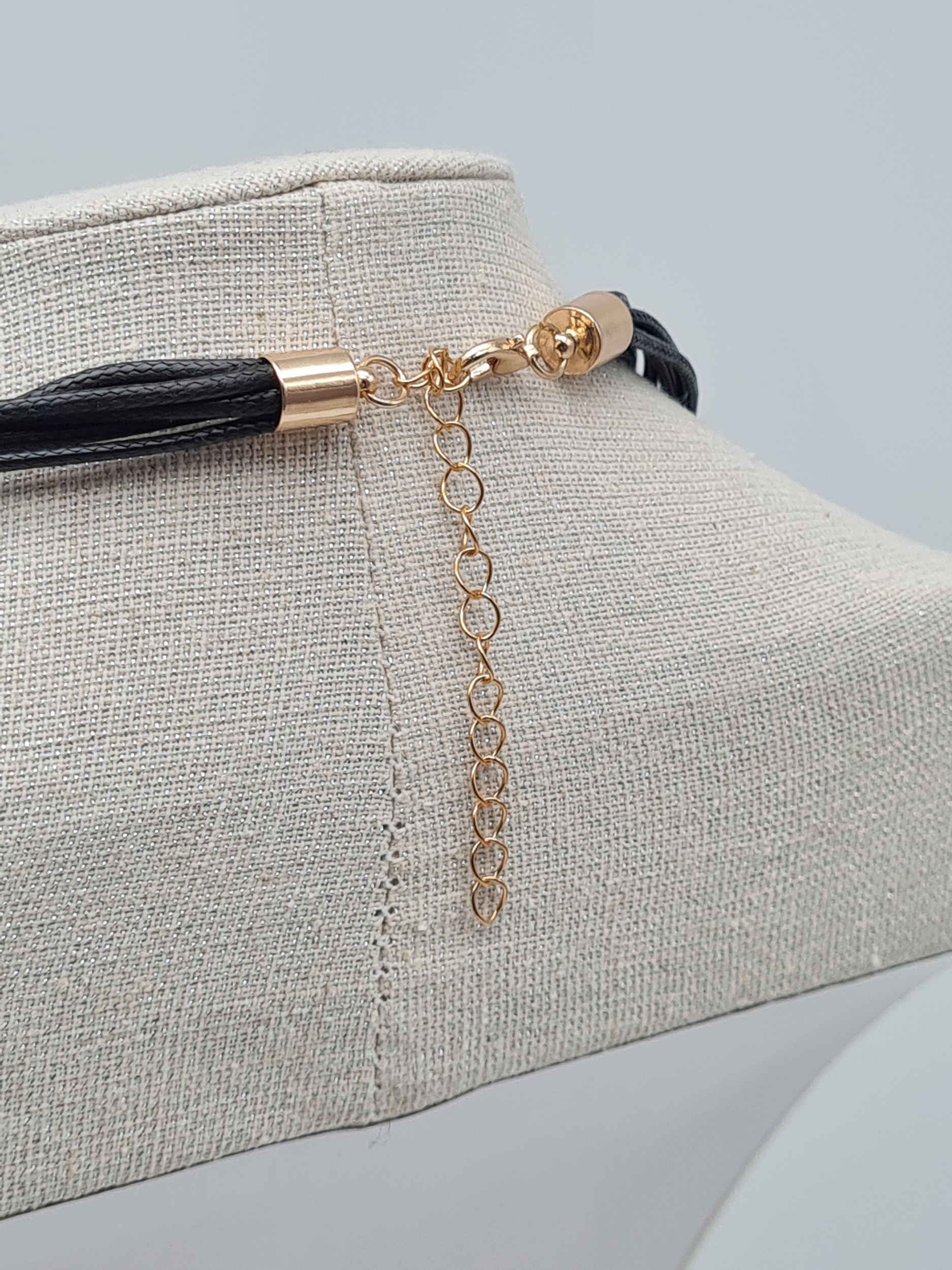 Die Cosmos Halskette vereint schwarzes Kunstleder mit verspielten Acryl-Elementen in Beige und Creme.