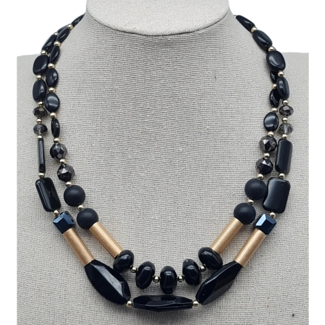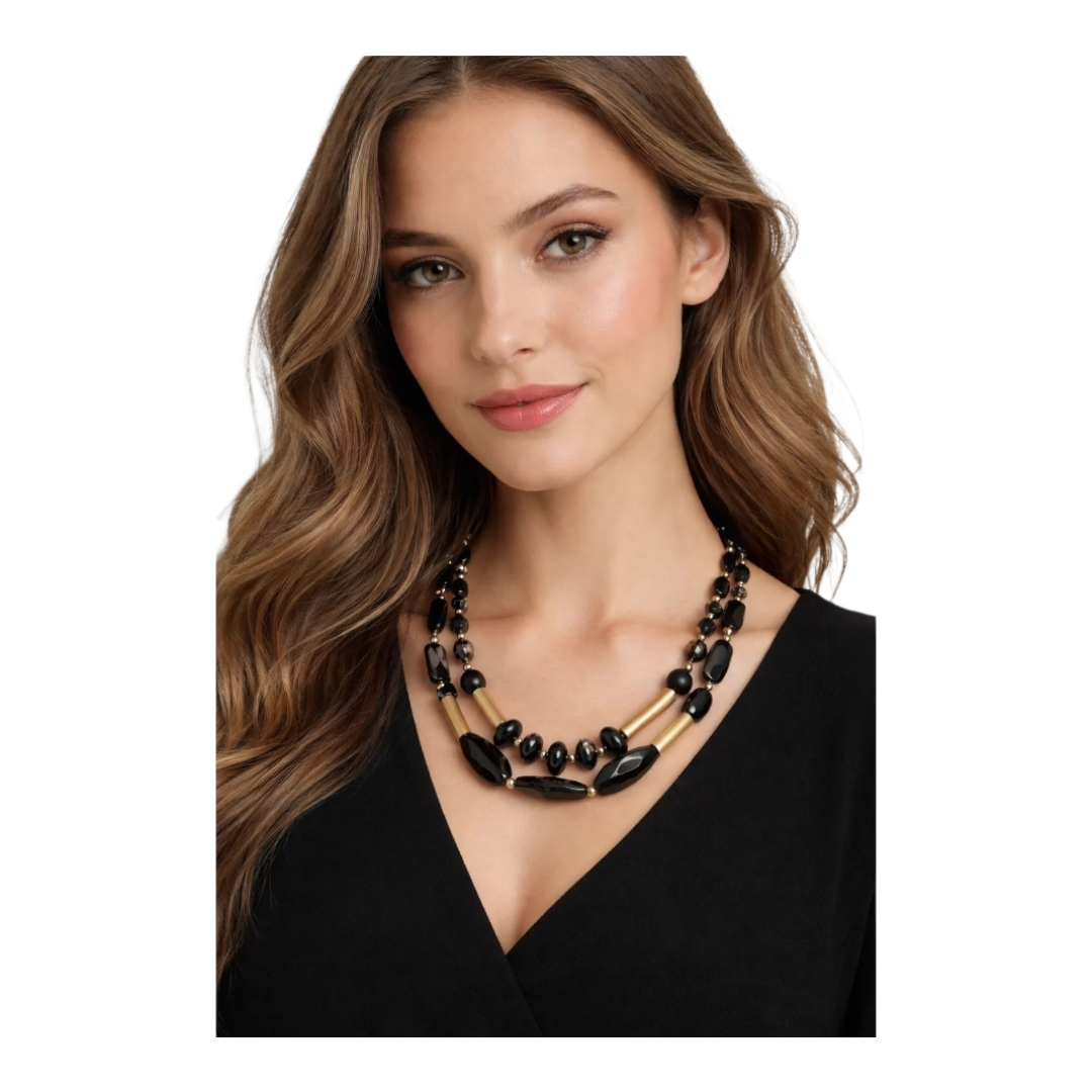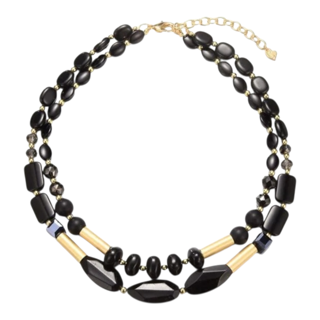 Die Sweet7 Doppel Kurzkette vereint klassische Eleganz mit modernem Design: schwarze Perlen treffen auf edle matte Gold-Elemente und schaffen einen Look, der sowohl zeitlos als auch ausdrucksstark ist.