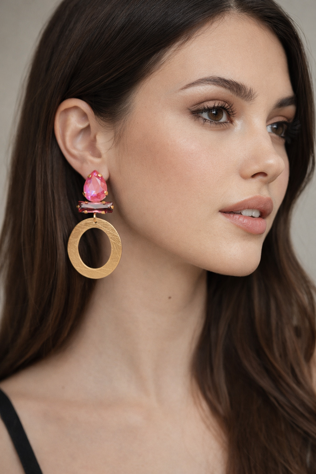 Diese trendigen Ohrhänger in matter Goldoptik ziehen die Blicke auf sich: Funkelnde pinke Strasssteine setzen strahlende Akzente und verleihen dem Schmuckstück eine frische, glamouröse Note.