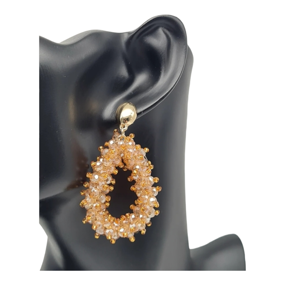 Diese zauberhaften Ohrhänger in Tropfenform sind veredelt mit feinen Apricot-Glasperlen, von denen jede einzelne mit einer orange-goldfarbenen Spitze schimmert. Das Spiel aus warmen Tönen und funkelnden Reflexen verleiht dem Schmuckstück eine edle, sommerlich-frische Ausstrahlung.