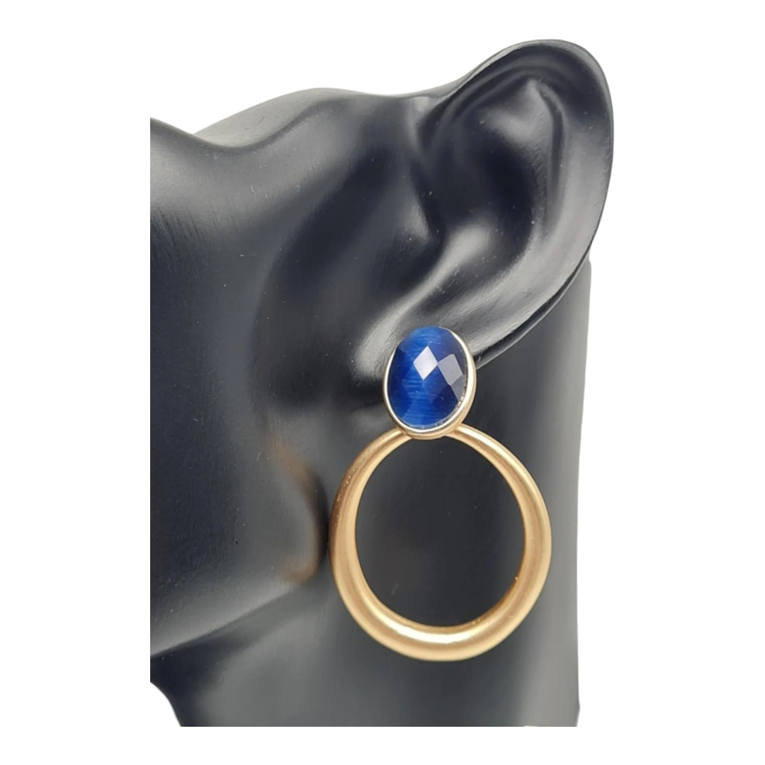 Diese außergewöhnlichen Ohrhänger in matter Goldoptik vereinen edles Design mit stilvoller Raffinesse: Am Ohr funkelt ein intensiver kobaltblauer Stein, gefolgt von einem kreisrunden Ring in mattem Gold. Ein harmonisches Zusammenspiel aus kraftvoller Farbe und zurückhaltender Struktur, das pure Eleganz ausstrahlt.