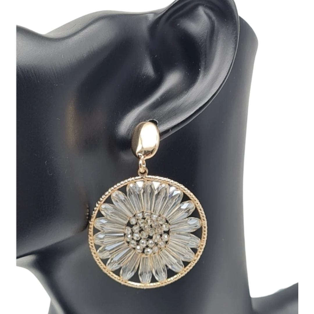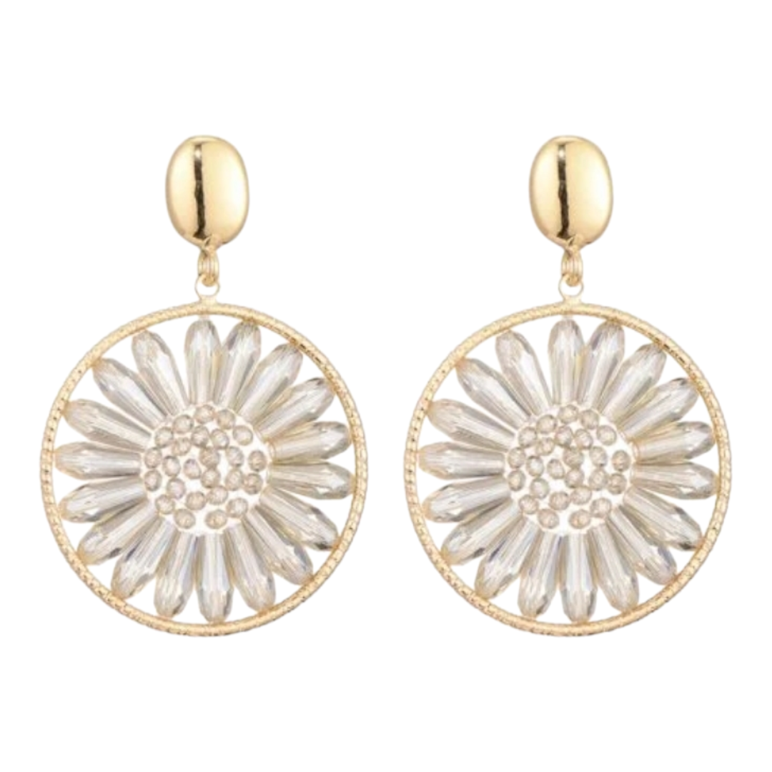Diese besonderen Ohrhänger vereinen klassisches Design mit floraler Raffinesse: Im runden Anhänger ist eine feine Blütenform eingefasst, die einer gläsernen Margerite ähnelt. Zart, verspielt und doch elegant – ein Schmuckstück, das an Leichtigkeit und Natürlichkeit erinnert.