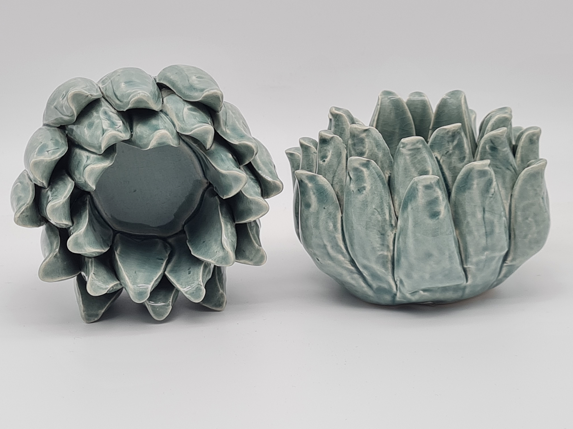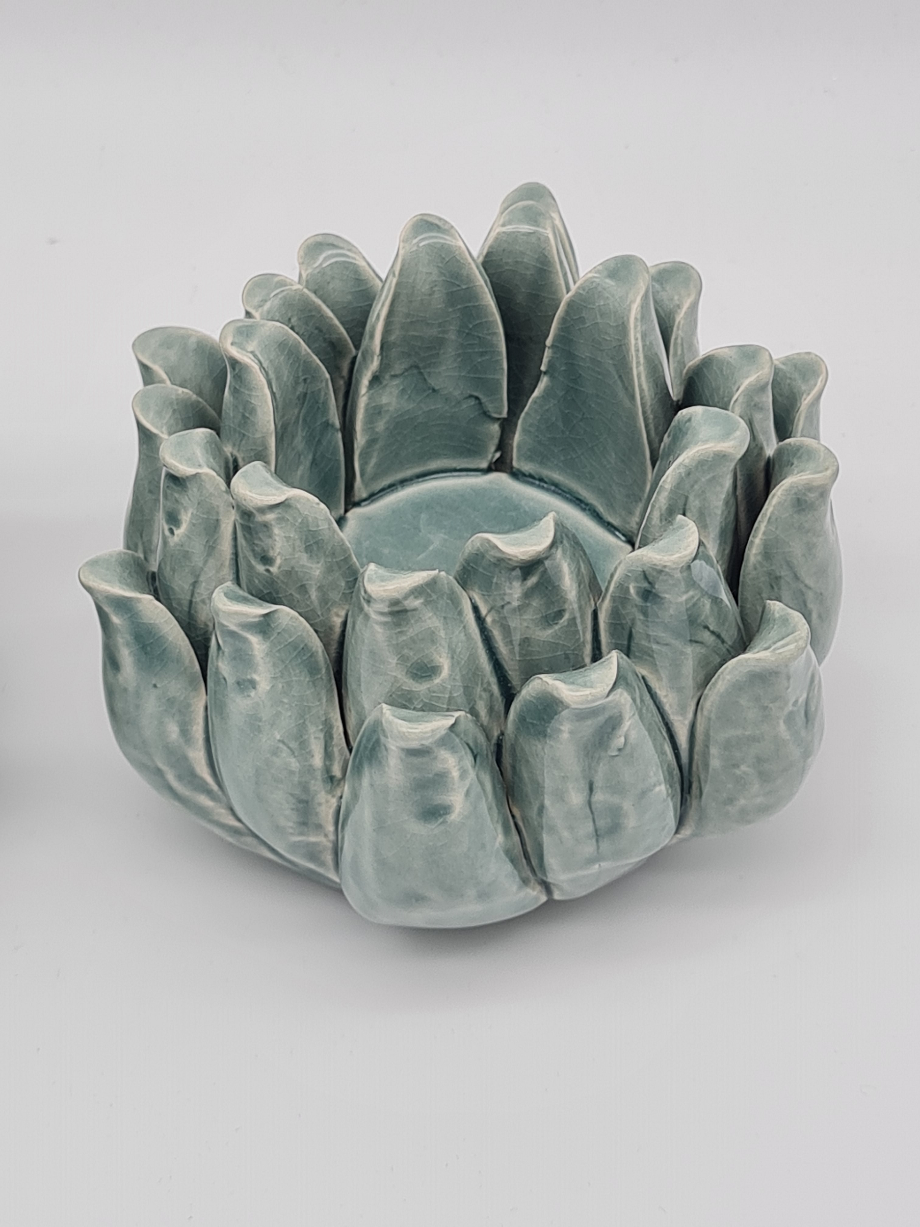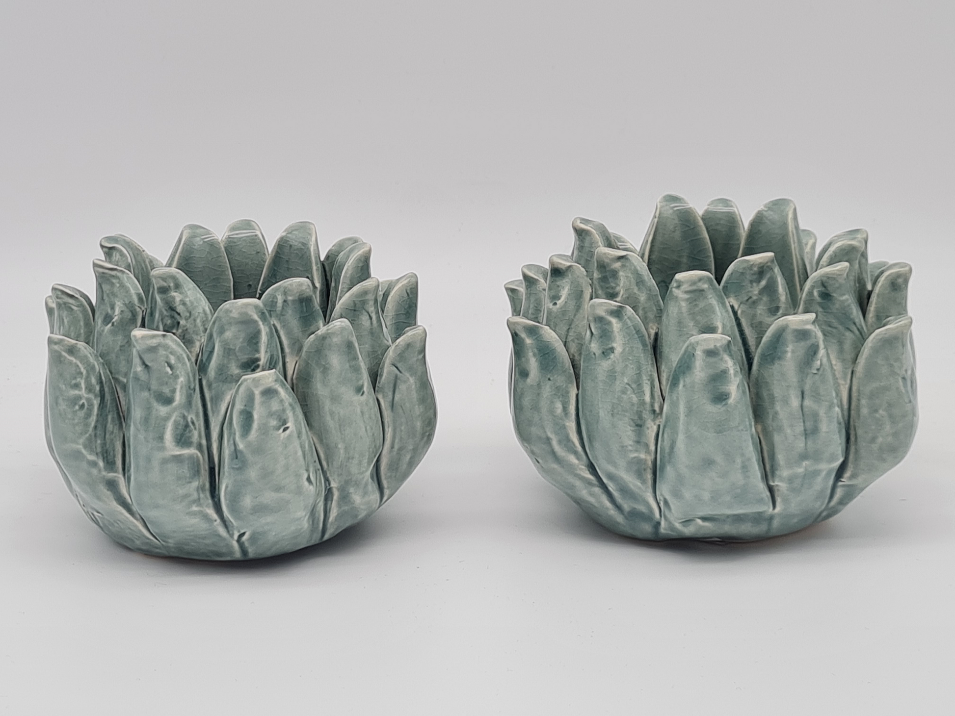 Dekorative Teelichthalter in Form von Lotusblüten, edel gestaltet in grünen Farbtönen.