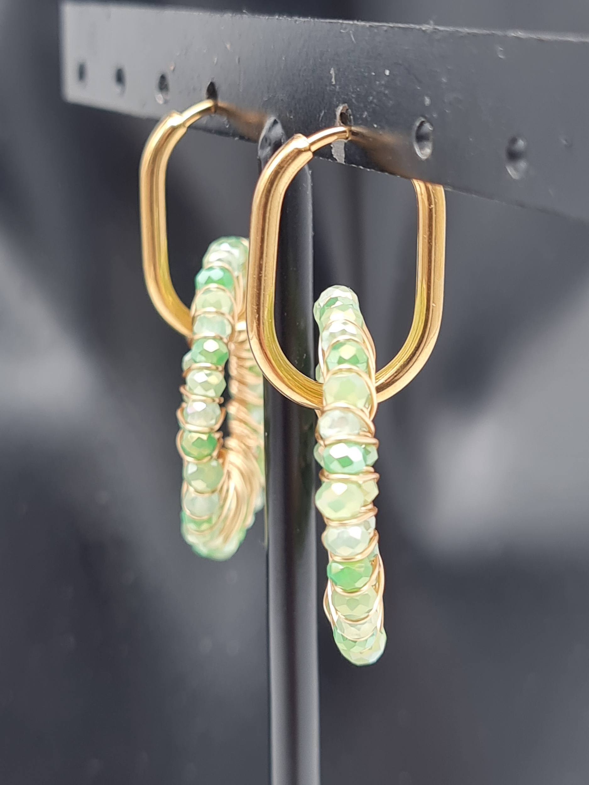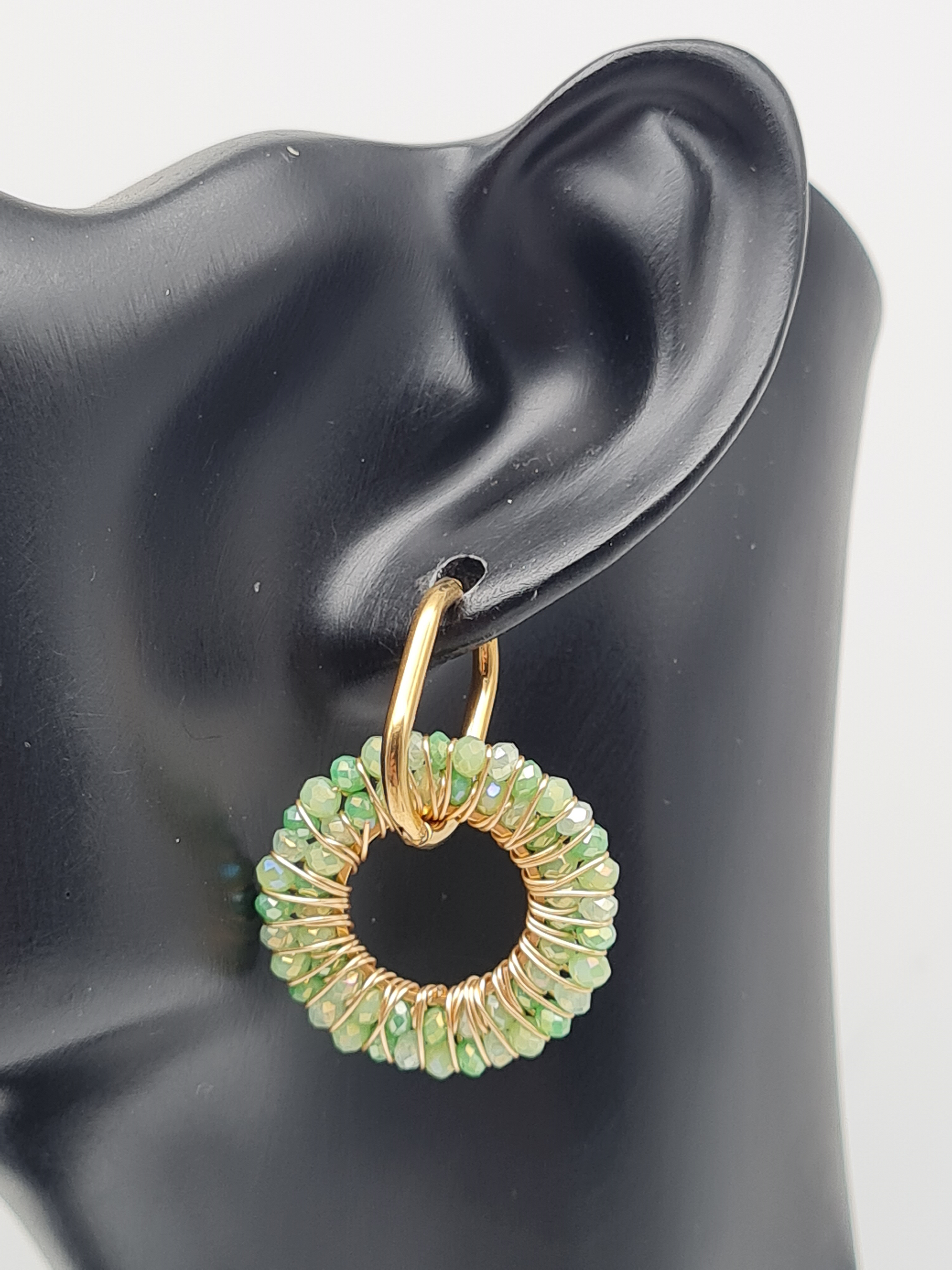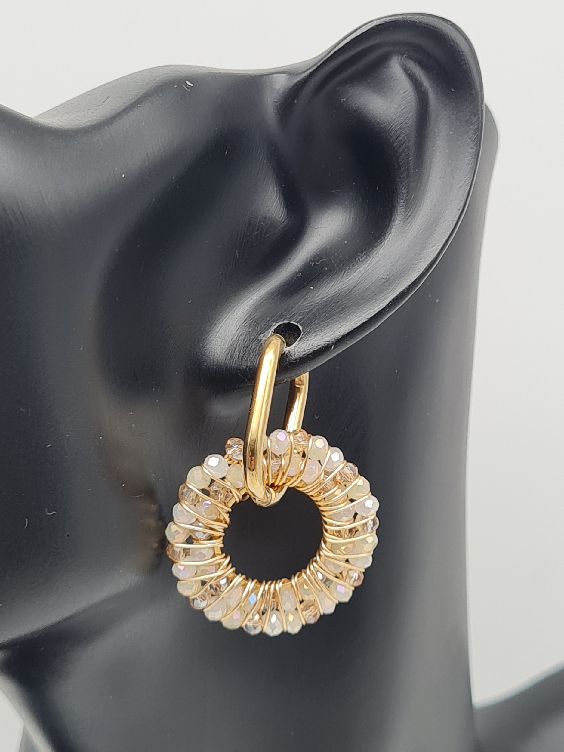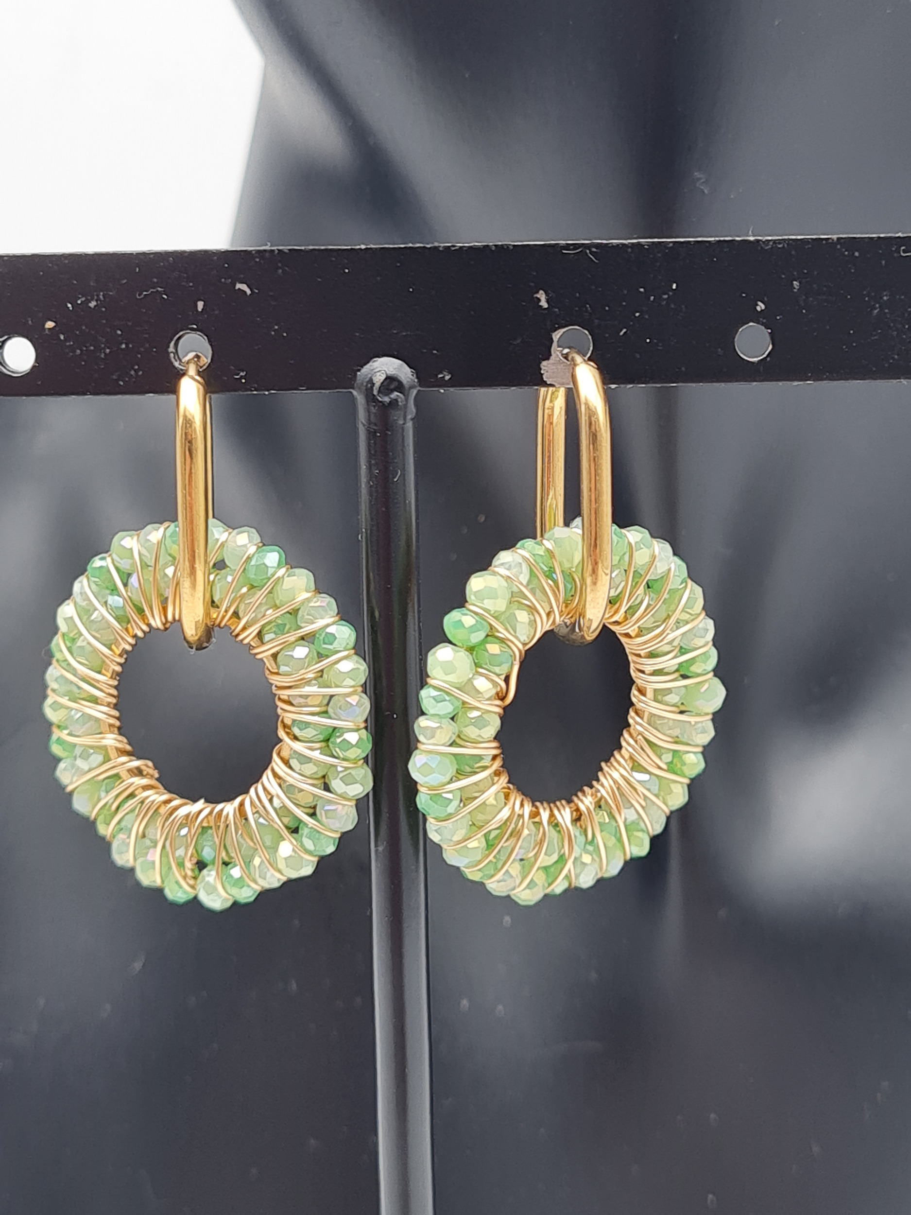 Diese edlen Creolen bezaubern mit einem runden Anhänger, besetzt mit feinen Crystal-Steinchen in sanften Hellgrün- oder Beigetönen. Das harmonische Design vereint Glamour und Leichtigkeit – ein vielseitiges Accessoire für Alltag, Business und besondere Anlässe. ✨💚🤍