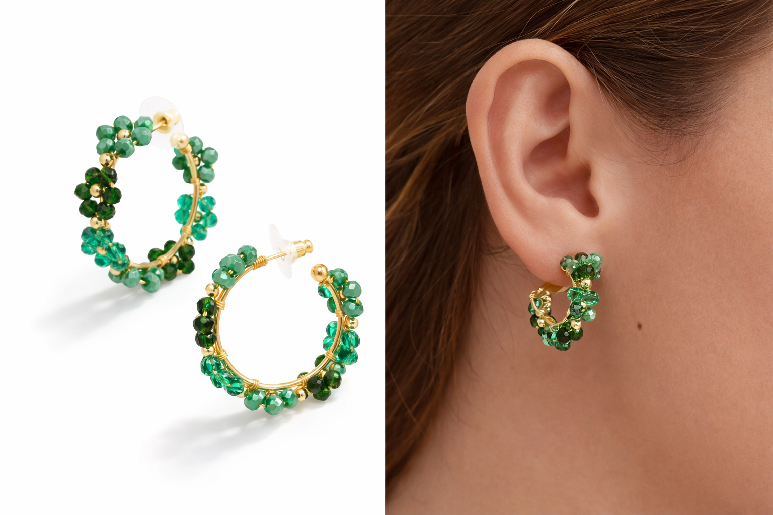 Blütentraum an deinen Ohren – Creolen mit grünen Blüten. Diese wunderschönen Creolen verzaubern mit ihren zarten grünen Blüten-Details und bringen Frühling und Sommer in deinen Alltag. Mit einer eleganten Länge von 3,7 cm sind sie das perfekte Statement-Piece für jeden Look – ob zum Spaziergang im Park, zum Picknick oder zum gemütlichen Kaffeeklatsch mit Freundinnen. Gefertigt aus hochwertigem Metall mit funkelnden Kristallperlen, strahlen diese Ohrringe in warmem Gold und setzen wunderbar natürliche Akzente. Die liebevollen Blüten-Details wirken verspielt und romantisch zugleich – ein echter Hingucker, der Komplimente garantiert! Besonders praktisch: Die Ohrringe sind nickelfrei und somit auch für empfindliche Ohren geeignet. Mit nur 16g Gewicht sitzen sie angenehm leicht und den ganzen Tag bequem. Perfekt kombinierbar mit passendem Schmuck und Accessoires – für einen harmonischen, blumigen Look, der deine Persönlichkeit unterstreicht.