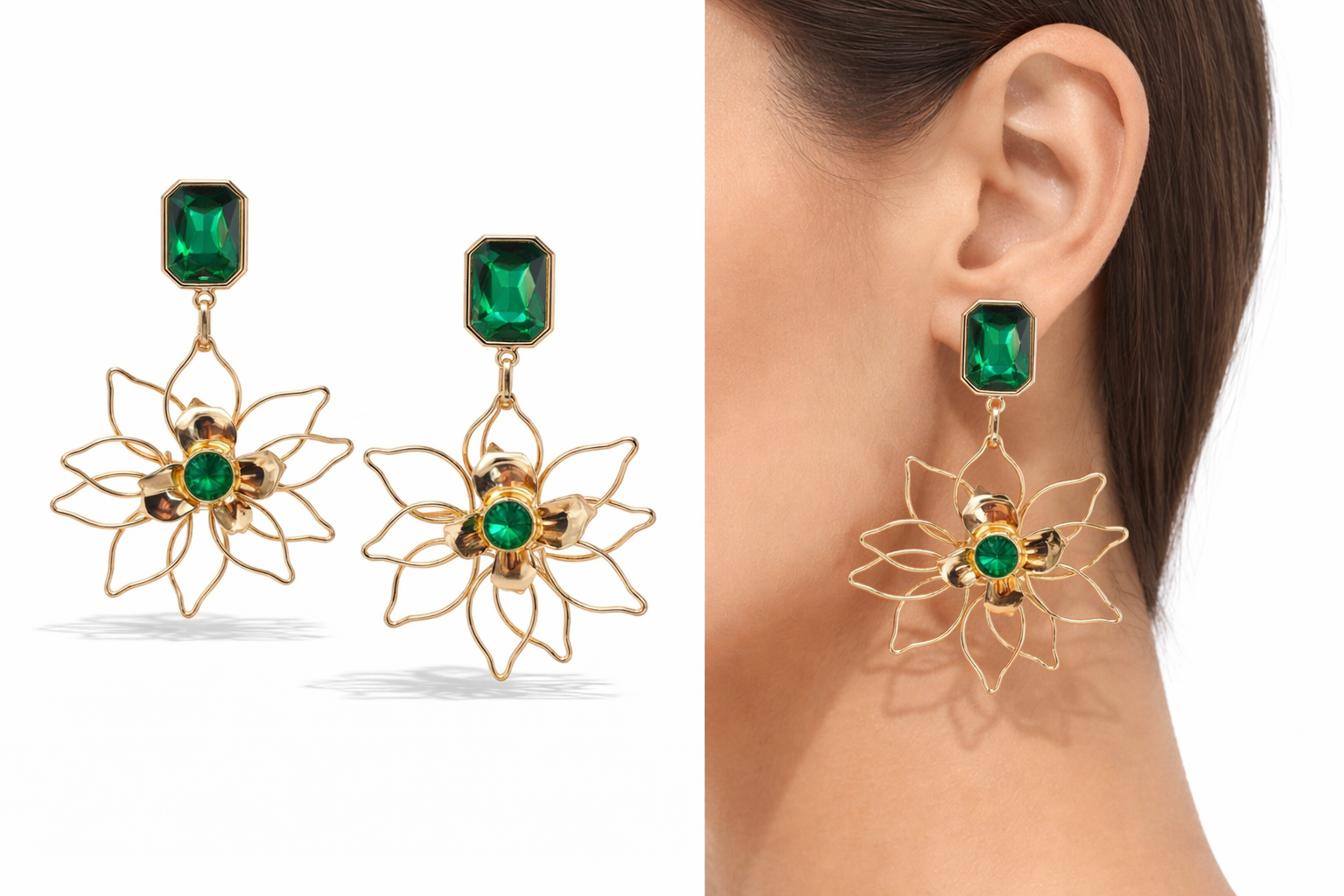 Funkelnde Blumenohrringe in Grün – Dein Statement-Accessoire Diese wunderschönen Ohrringe von Yehwang verzaubern mit strahlenden grünen Strass-Steinen und einem zarten blumigen Anhänger. Das glamouröse Design fängt jeden Blick ein und verleiht deinem Look sofort mehr Glanz und Eleganz. Perfekt für Partys, besondere Anlässe und elegante Abendlooks – ein Schmuckstück, das deinem Outfit Farbe, Glanz und Stil schenkt. Länge: 8,5 cm | Durchmesser: 5,9 cm | Nickelfrei