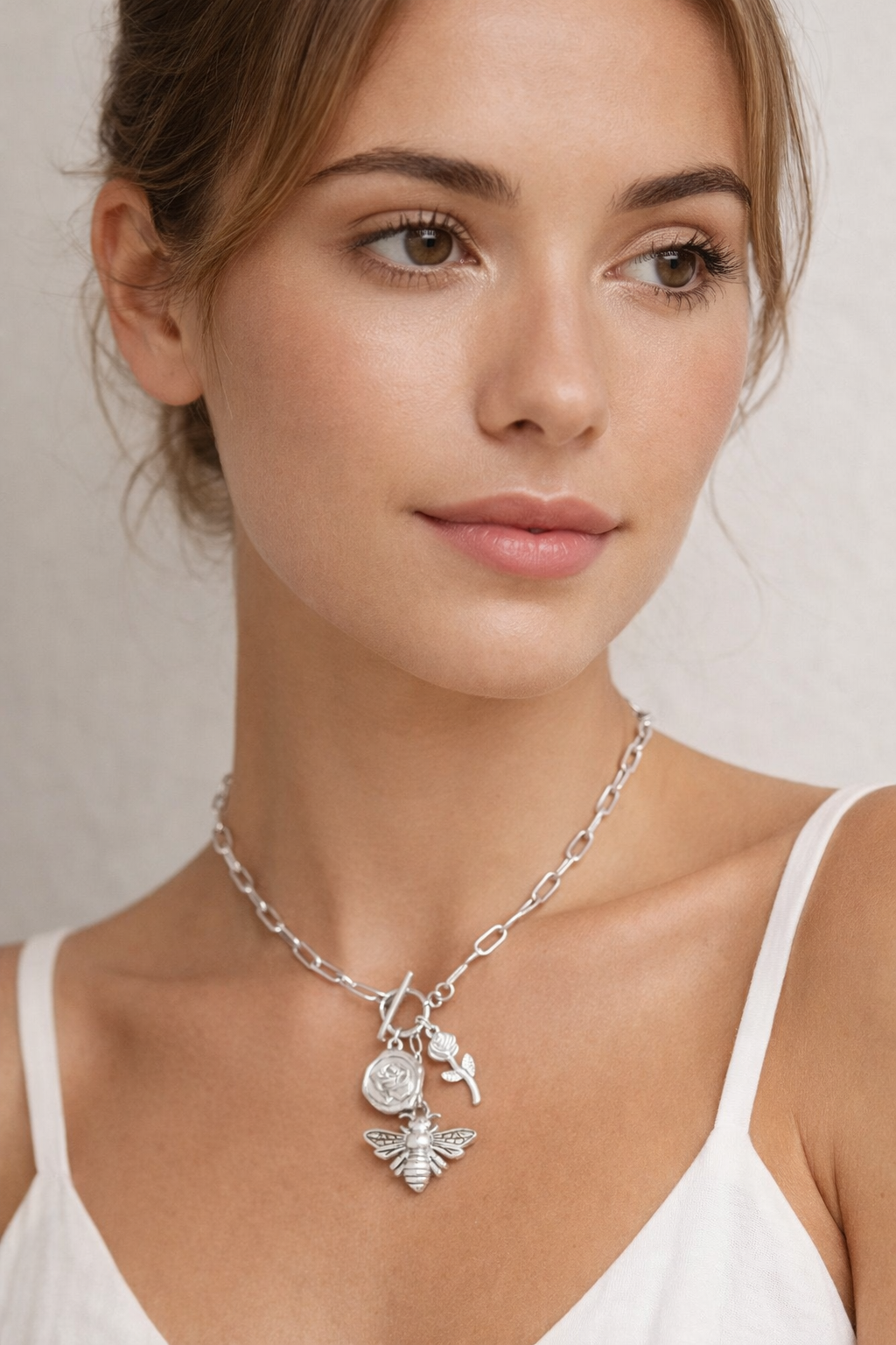 Verspielt und symbolstark: Die filigrane Halskette vereint zarte Rosen-Details mit einem liebevoll gestalteten Bienenanhänger. Ein goldfarbener Eyecatcher, der Naturverbundenheit und femininen Charme perfekt miteinander verbindet. ✨