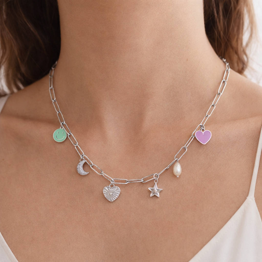 Modern, vielseitig, einzigartig: Die Halskette aus hochwertigem Edelstahl in Silberoptik begeistert mit sechs detailreichen Charms, die deinem Look eine persönliche Note verleihen. Perfekt zum Kombinieren und für jeden Anlass ein glänzendes Highlight.