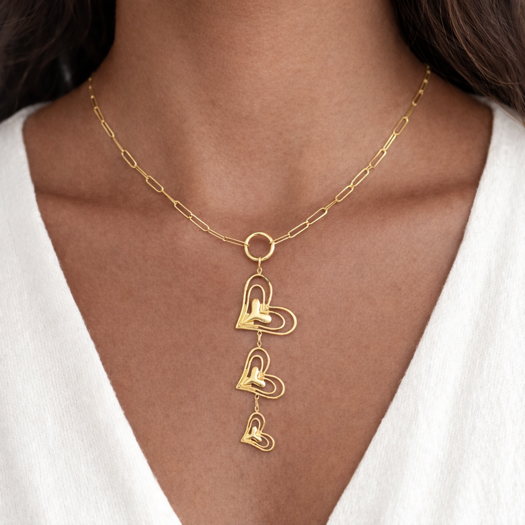 Dreifach schön, dreifach stilvoll: Diese elegante Statement-Halskette vereint drei edle Herz-Elemente zu einem zeitlosen Schmuckstück. Ein glänzendes Must-have, das Liebe, Eleganz und Persönlichkeit perfekt in Szene setzt. ✨
