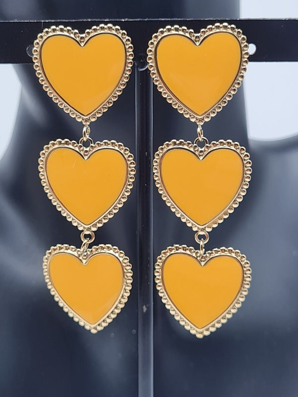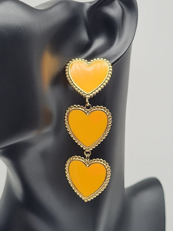 Yehwang Ohrringe 3 anmutige Herzen in einer Reihe Orange Edelstahl