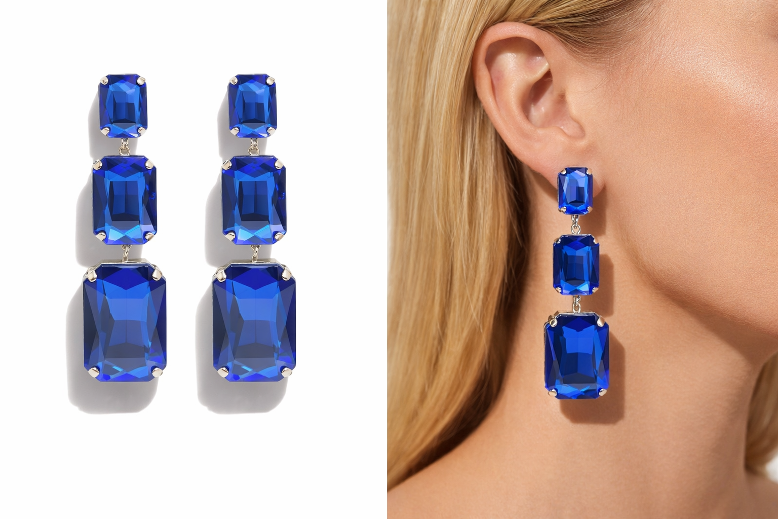 Ohrhänger Ohrringe 3 Glasperlen Reihe Blau Statement Yehwang