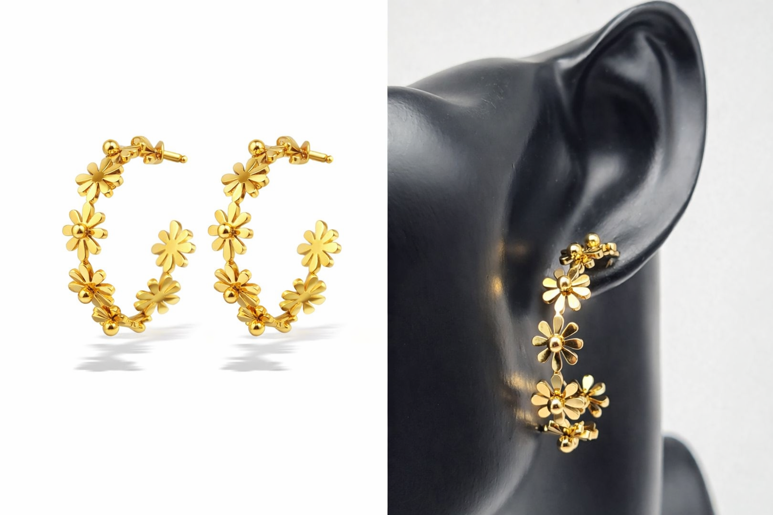 Yehwang Ohrringe „Florale Finesse" – blumige Eleganz in Gold Goldfarbene Creolen mit zarten Gänseblümchen-Details, die zeitlose Eleganz mit verspieltem Charme verbinden. Das florale Design bringt sommerliche Leichtigkeit und Frische in jeden Look – ideal für fröhliche Alltagsstyles, Gartenpartys und besondere Momente. Nickelfrei für angenehmen Tragekomfort. Durchmesser: 3,5 cm