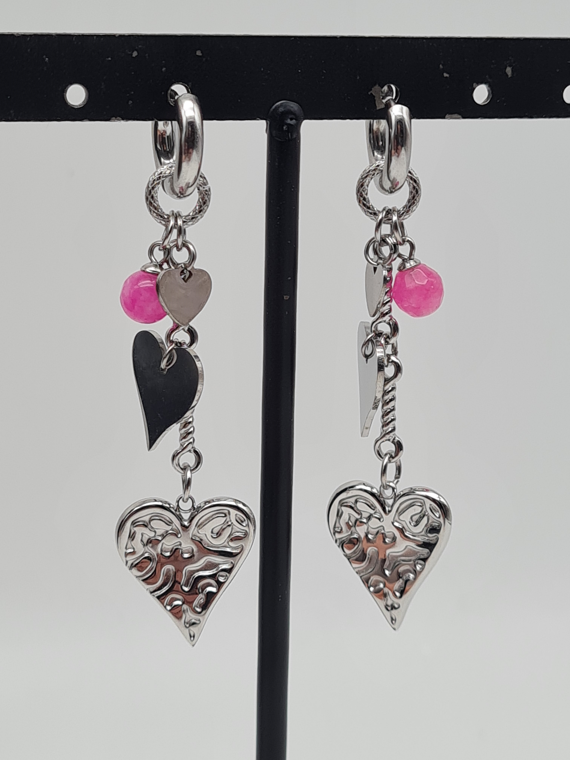 Romantisch und verspielt: Diese Ohrringe tragen die Signatur „Love“ und sind mit drei kleinen Herzchen sowie einem funkelnden pinken Kristallstein verziert. In edlem Silberton gefertigt, verkörpern sie Liebe und Eleganz zugleich. Dank des nickelfreien Materials sind sie angenehm zu tragen und das perfekte Accessoire für romantische Anlässe oder als liebevolles Geschenk.